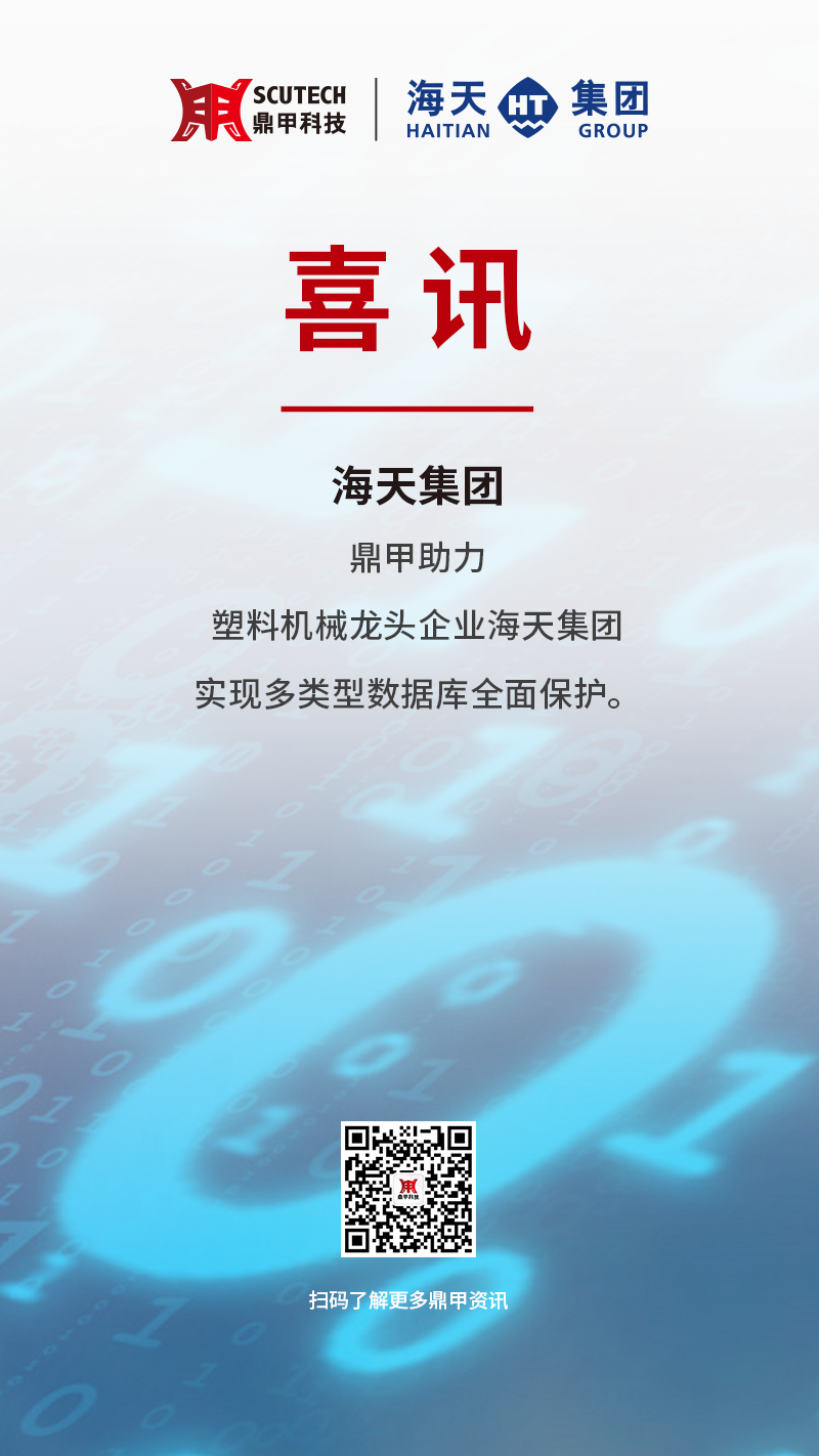 近日,鼎甲助力中國最大的塑料機械生產基地——海天集團完善災備建設,對其核心的SAP HANA、Oracle 、SQL Server、MySQL等多種數據庫以及 VMware 虛擬化平臺實現整體自動的數據生命周期管理,全面構筑數據安全,獲得客戶的認可。