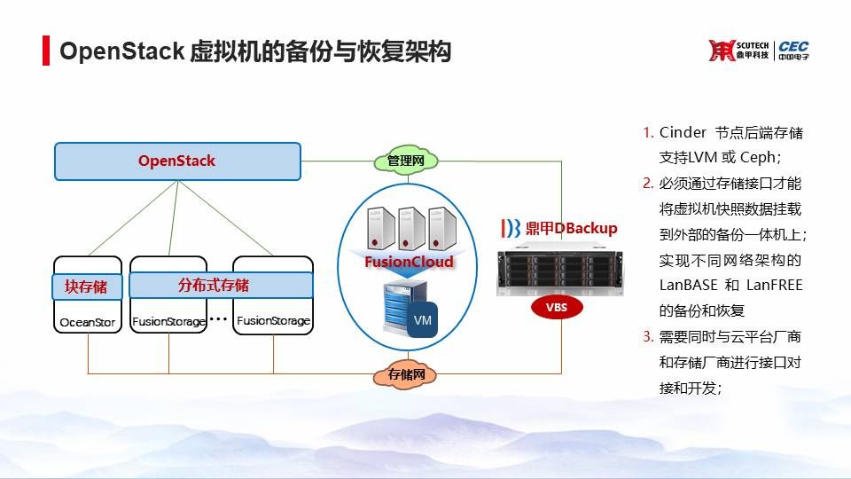 對OpenStack來說,其實和備份真正打交道的就幾個部分。第一個核心組件,是NOVA,它是記錄整個OpenStack虛擬機的配置和管理信息的,第二塊是cinder,它是管理數據存儲對象的,我們的虛擬機實際上就是通過cinder來進行存儲的。