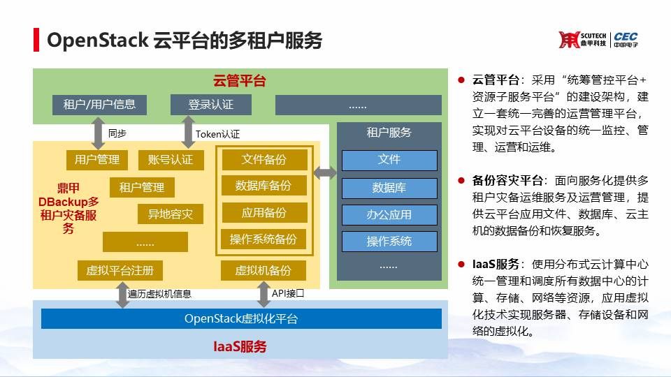 那我們可以看到,如果要實現OpenStack 云平臺的多租戶服務,我們做了什么呢?首先第一個,如果你要實現剛才我們所說的不需要備份代理機,而云平臺又沒采用通用的架構,它采用的是外置存儲通過LVM接入的OpenStack。鼎甲多租戶僅保留超級管理員和運維管理賬號,租戶和用戶賬號通過云管平臺同步獲取。