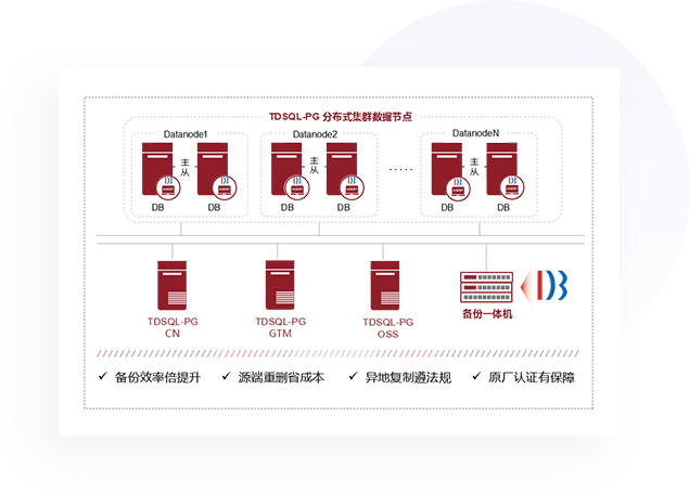 鼎甲與騰訊云聯合改造 TDSQL-PG(TBase)的 OSS(平臺管理系統),在騰訊 OSS 界面上增加了一種名為“鼎甲存儲”的備份存儲介質。打通與 DBackup 數據傳輸的通道,將數據直接備份到 DBackup 的存儲池。實現了 TDSQL-PG 的集群級別無緩存備份和恢復,支持重復數據刪除和數據遠程復制,提升數據的備份效率,以更便捷的方式對數據庫實現備份管理,共同為用戶提供更敏捷安全的數據保護解決方案,助力千行百業數字化轉型。