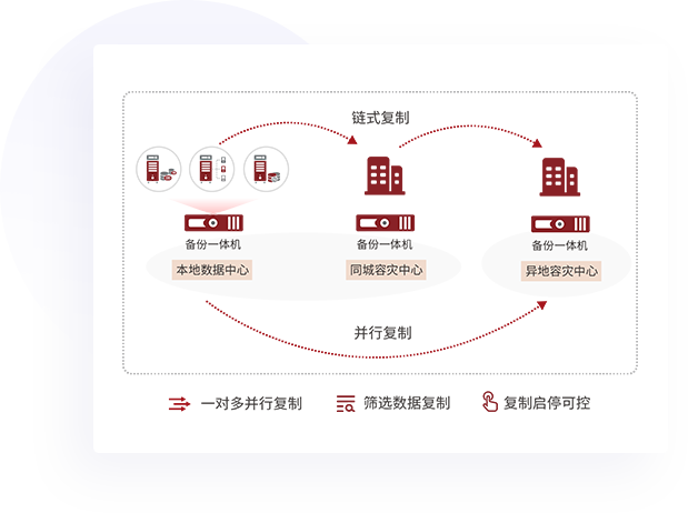 DBackup 為適應多種容災場景,新增支持存儲池的一對多并行復制,可直接將本地數據中心的數據并行復制到多個容災中心,當本地數據中心出現故障時可指定同城或者異地容災中心進行數據的快速恢復,豐富了異地容災的多樣性和可靠性!用戶還可按資源、備份類型篩選出核心數據進行復制,減少不必要的存儲和帶寬成本,從而提升池復制的時效性,幫助用戶更高效安全地搭建兩地三中心方案!
