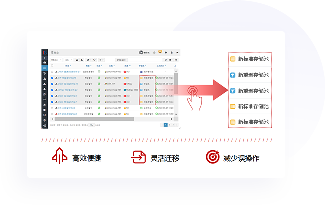 針對存儲設備空間即將耗盡或測試轉正式環境場景,DBackup 新增一鍵遷移到新存儲設備功能。通過批量設置和智能判斷原備份目標機制,讓運維人員告別機械重復操作,輕松完成備份目標遷移工作。