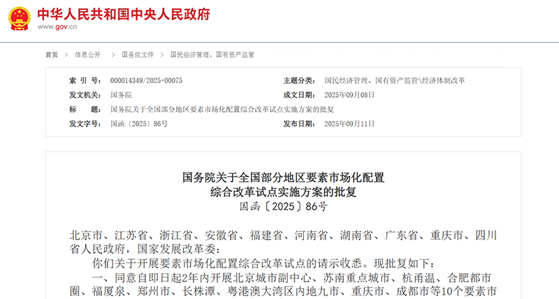 9月8日,國務院正式批復《要素市場化配置綜合改革試點總體方案》。在北京通州、蘇南五市、杭甬溫、合肥都市圈、福廈泉、鄭州、長株潭、粵港澳大灣區內地九市、重慶、成都等 10 個重點區域,將開展為期兩年的綜合改革試點。