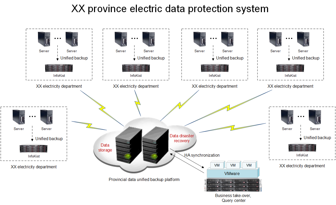 Cities build relatively independent backup sub-servers using InfoKist which then are connected with provincial cloud backup platform through a special line to synchronize data. With off-site high availability technology of Scutech, a remote virtualization platform can be built as a business takeover disaster recovery center. Once an accident occurs, it can instantly take over the business server and maintain normal operation. In terms of management and monitoring, users only need to log onto the web interface to set up and manage clients. Municipal departments are independent from each other while provincial departments can perform unified management.