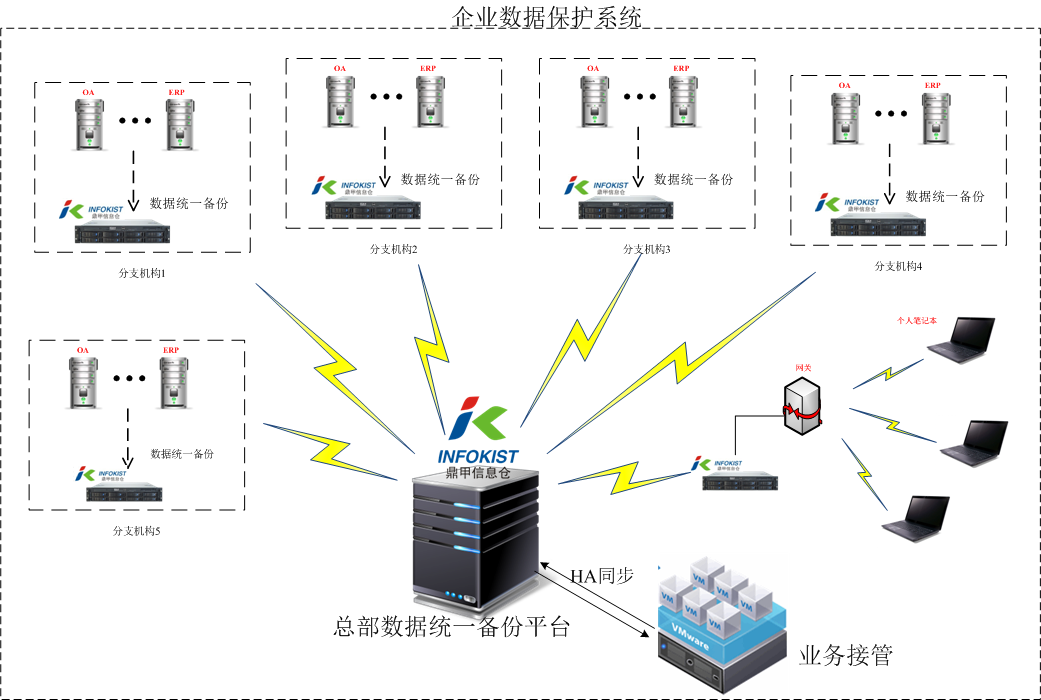InfoKist will deploy a unified backup platform at headquarter and subsystems at fellow departments to backup and protect the business server. Subsystems will be connected to headquarter and synchronize data to the business takeover platform which will take over the business in case of server downtime. Headquarter can perform unified monitoring and management towards all subsystems. A gateway server will also be deployed for sales personnel to connect with the internal server and backup their laptops.